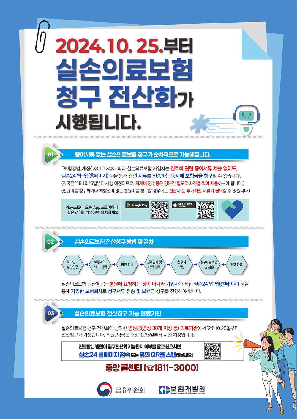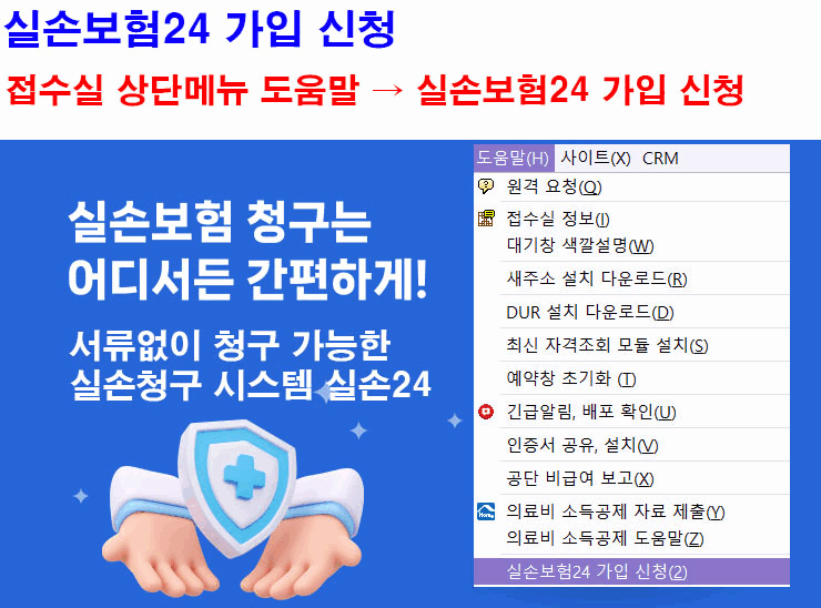실손의료보험 청구 전선화 안내(실손24) 정부에서 실시하고 있는 실손의료보험 청구 전산화 확대에 따라전산청구 방법 및 절차 등을 안내드리니 참고하여 주시기 바랍니다.- 2025년 10월 25일 의원급 의료기관 및 약국 대상 확대 ※ 실손24 참여 관련 문의: 전송대행기관(☎1811-3000) 가입방법: 접수실 상단메뉴 → 도움말 → 실손24 가입신청 자세히 보기: https://hysr.tistory.com/83 카테고리 없음 2025.10.23