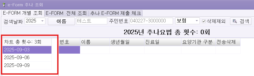 한의사랑은 진료실 추나조회 버튼 누르면 차트에서 기록된 환자의 추나 총 횟수는 확인 할수 있습니다.