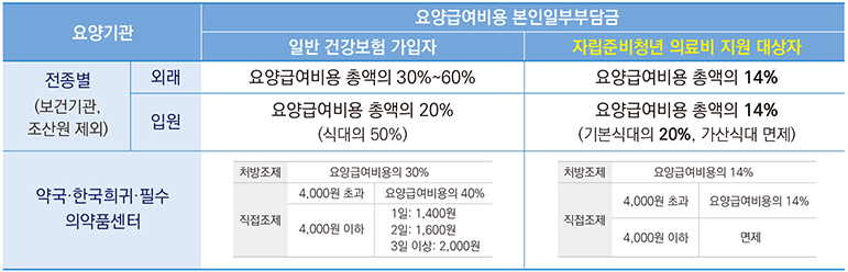 자립준비청년 의료비 지원 본인일부부담금 2023년 12월 01일 진료분부터 자립준비청년 외래·입원 요양급여비용 총액의 14%만 부담 1) 전종별(상급종합병원, 종합병원, 병원, 치과병원, 한방병원, 요양병원, 정신병원, 의원, 치과의원, 한의원) 지원 적용 2) 보건기관(보건의료원, 보건소, 보건지소, 보건진료소), 조산원 지원 제외 3) 선별급여, 전액본인부담, 비급여는 지원 제외 4) 질병군 포괄수가, 신포괄수가는 지원 포함(선별급여, 전액본인부담, 비급여는 지원 제외) ※ 1. 위 표의 ‘요양급여비용 총액의 14%’ 적용: 1)외래·입원진료 특수장비(CT, MRI 등) 총액, 2)특수재료 및 관련 행위료, 3)의약분업 예외환자 약값총액, 4)만성질환 진찰료, 5)상급종합병원 초진진찰료·재진진찰료, ..